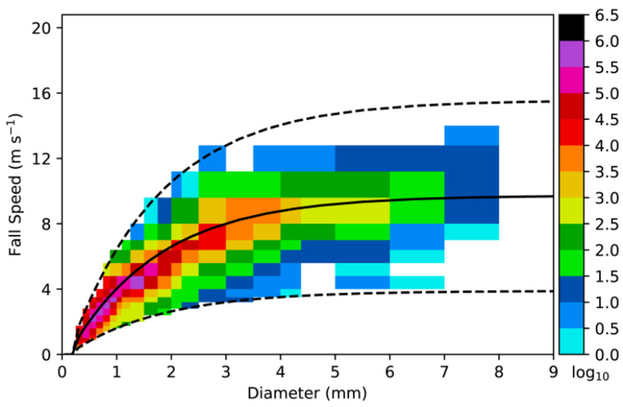 雨滴粒径分布(Raindrop Size Distribution:RSD)是气象、水文学的重要概念,它显示了构成降雨的雨滴(雨滴)的大小及其数量的分布特性。雨滴直径(通常为0.1~6mm通过表示每个程度的个数和体积的比例,可以定量解析降水的强度、种类(雨、雾雨、暴雨等),甚至云的发展过程和降雨形成机制。雨滴粒径分布作为雷达观测的降雨量推定、气象模型的精度提高、地面降水观测、甚至气候变化研究等广泛领域的基础数据被利用。