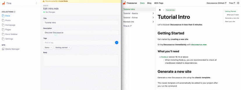 优点:TinaCMS 依托 Git 的运作模式,自然地实现了内容的版本控制与多人协作;结合 React 生态的高灵活性与实时预览功能,大幅提升了开发者与内容创作者之间的协作效率。其前端自由度较高,能够根据不同项目需求构建定制化的编辑体验,是其突出的优势之一。
