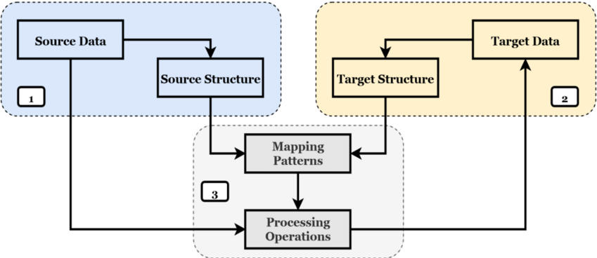 2. 数据映射过程:识别源端、识别目标端,并通过映射模式将两种结构进行关联。