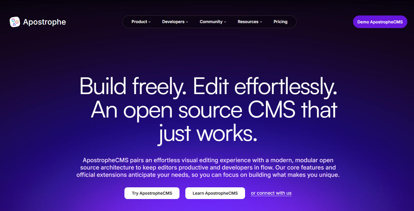 ApostropheCMS 是一款基于 Node.js 的开源、支持无头架构(Headless)的内容管理系统(CMS),以灵活的内容建模与模块化扩展能力为核心特征。其设计理念在直观的所见即所得(In-context)编辑体验与面向开发者的高度可定制性之间取得平衡,能够为企业级网站和数字平台建设提供现代化的 CMS 解决方案。凭借 API First 的架构设计,它可以方便地与前端框架及外部服务进行集成。