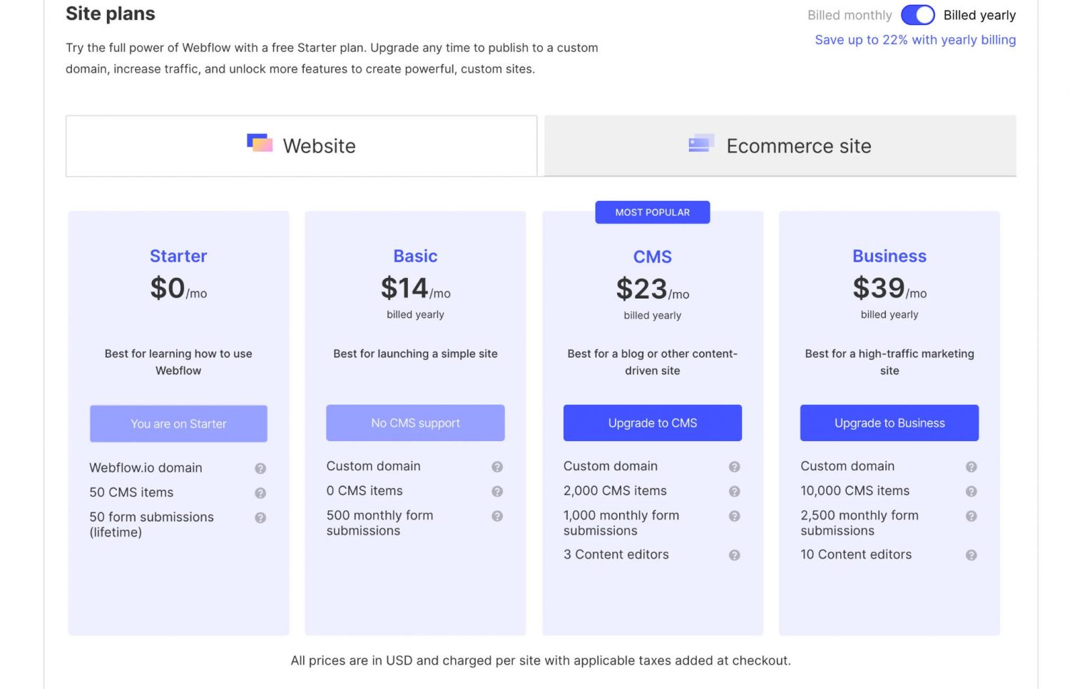 2. 使用 Webflow CMS 的成本和定价方案。