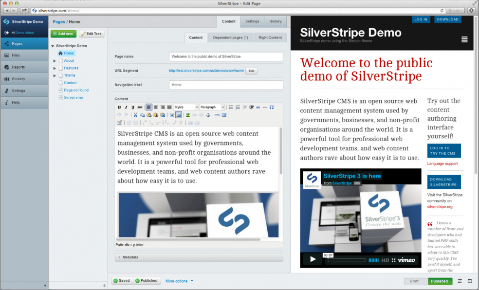 优点:SilverStripe 集成了 MVC 框架和 CMS,允许在单一平台上实现内容管理和应用程序开发。其高度可扩展性为开发者提供了诸多便利,包括使用 ORM 进行数据模型管理、使用模板引擎分离显示层以及通过扩展模块添加功能。它还配备了标准的管理面板(CMS 用户界面),支持 REST API 和 GraphQL 集成,并且可以作为无头 CMS 使用。