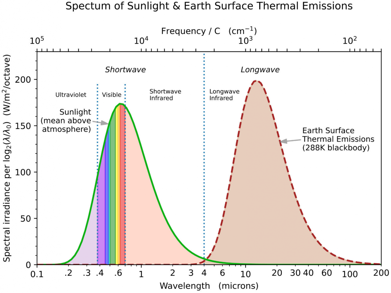2. 太阳光谱强度(大气顶平均值)与地球表面发射的热辐射。
