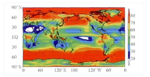1. 1979年-2009年全球平均总云量分布。