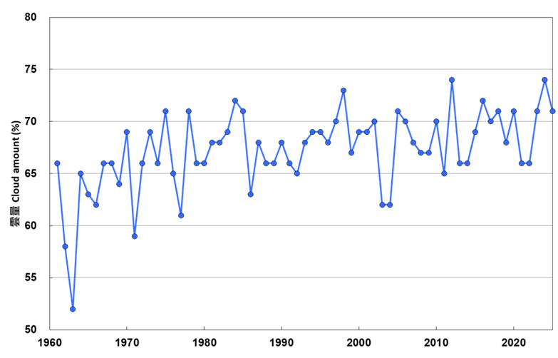 2. 天文台总部录得的年平均云量(1961-2025)。